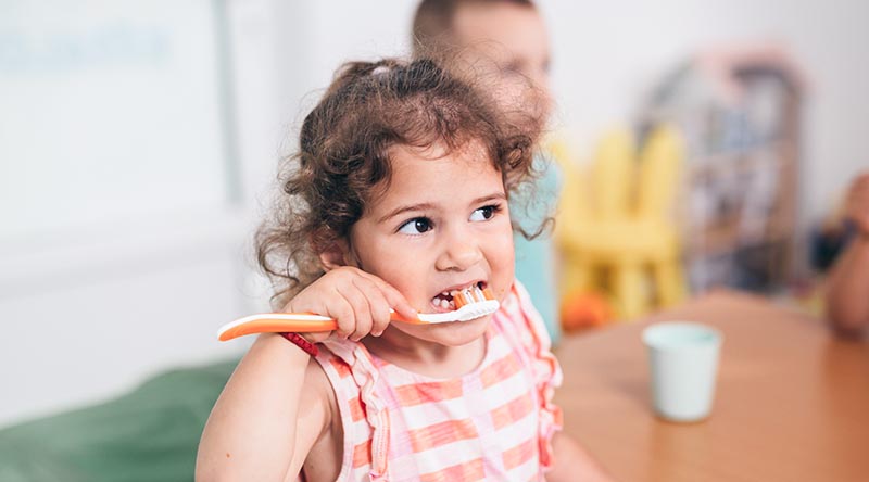 Doch es reicht nicht aus, sich als Elternteil auf die Gruppenprophylaxe in der Kita zu verlassen. Zähneputzen ist häufig keine Tätigkeit, die Kindern Spaß macht, deshalb sollten Sie vor allem in der Anfangszeit auf die richtige Putztechnik Ihres Kindes achten und versuchen es zum Zähneputzen zu animieren. Denn die Pflege der Milchzähne hat Auswirkungen auf die späteren, bleibenden Zähne, weshalb eine gute Mundhygiene bereits im Kindesalter unabdingbar ist. Schon vor dem Durchbruch des ersten Milchzahns kann der Nachwuchs durch Massieren des Zahnfleischs an eine tägliche Zahnpflege gewöhnt werden. Dadurch wird eine gute Ausgangssituation geschaffen und das Zähneputzen bereitet im Anschluss weniger Probleme.